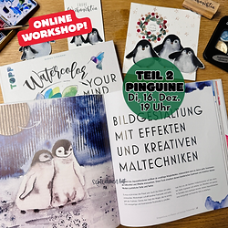 Watercolor Workshop: Pinguine zeichnen & malen Teil 2 Dienstag, 16. Dezember 2025 | 19:00 – 21:30 Uhr Im zweiten Teil unserer winterlichen Pinguin-Reihe tauchen wir noch tiefer in die Welt der Aquarellmalerei ein! Nachdem wir in Teil 1 mit einfachen Hilfsmitteln verschiedene Pinguine gestaltet haben, widmen wir uns diesmal dem freien Zeichnen und Malen der kleinen Frackträger. Du lernst, wie du Pinguine selbst skizzierst und anschließend in Aquarell zum Leben erweckst. Damit dir der Einstieg leichter fällt, bekommst du zusätzlich eine Vorlage, die du verwenden kannst. Ein weiterer Schwerpunkt dieses Workshops ist das kreative Gestalten des Hintergrunds. Wir experimentieren mit Farben, Texturen und einfachen Techniken, damit deine Pinguin-Motive noch stimmungsvoller und lebendiger wirken. Dieser Workshop richtet sich an: ✨ alle, die an Teil 1 teilgenommen haben ✨ Fortgeschrittene, die Lust auf neue Techniken und etwas mehr zeichnerische Freiheit haben Du bekommst: ✔️ Live-Workshop von 19:00 bis 21:30 Uhr ✔️ eine Aufzeichnung wenige Tage nach dem Termin ✔️ eine Materialliste als Video – kommt rechtzeitig vorher zu dir Ich freue mich schon sehr darauf, im vertiefenden zweiten Teil gemeinsam mit dir zu zeichnen, zu malen und kreative Hintergründe zu erschaffen.